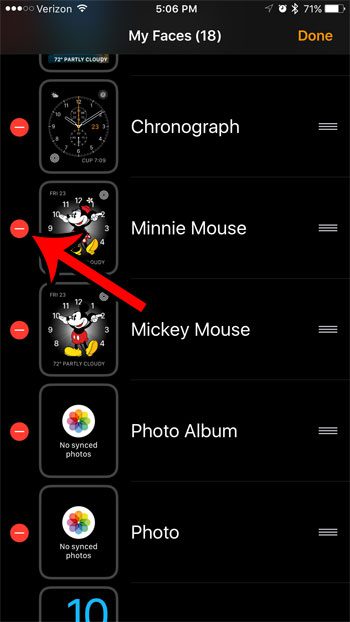第五步:触摸红色消除按钮删除表盘。对于您想要删除的任何其他表盘,重复步骤 4 和 5,然后点击完毕按钮位于屏幕右上角。