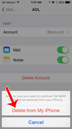 第 5 步:触摸从我的 iPhone 中删除按钮以确认您要从 iPhone 中删除 AOL 电子邮件帐户。
