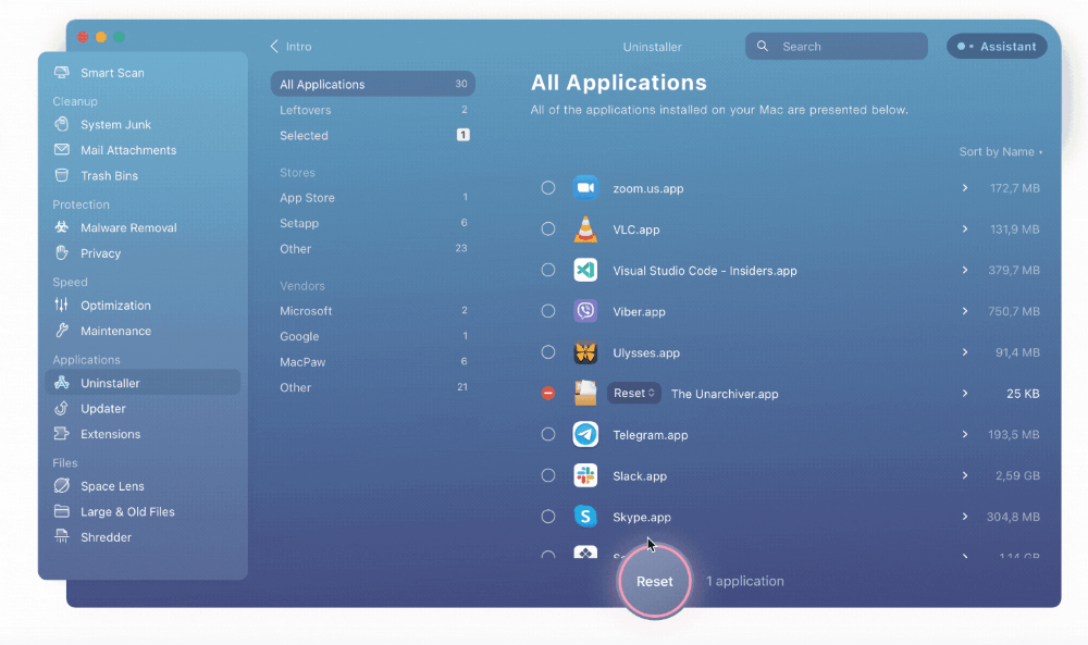 CleanMyMac X还可以让您重置麻烦的应用程序。在某些情况下,这可以解决因应用程序故障而产生的问题。按照以下步骤清除您的应用程序首选项并删除应用程序保存的所有用户相关信息: