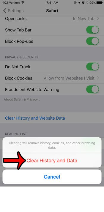 您可以通过以下方式删除 iPhone Safari cookie:设置>狩猎之旅> 攻丝清除历史记录和网站数据> 然后点击清晰的历史记录和数据。