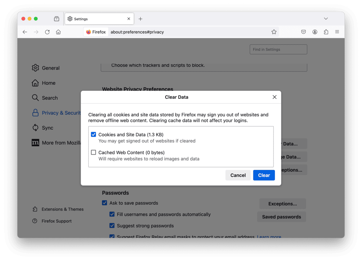 最后,要删除 Firefox 浏览器中的 cookie,您只需花费几秒钟。要清除 Firefox 浏览器中的 cookie: