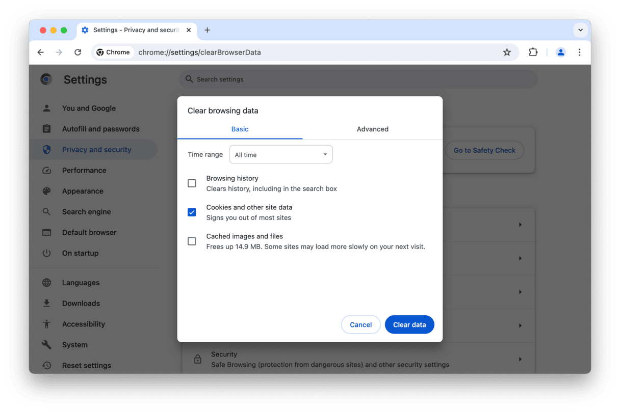 要手动删除 Chrome 浏览器中的 cookie,您必须进入“设置”的“隐私和安全”部分。在这里,您可以管理所有网站数据并控制网站设置。请参阅以下有关如何在 Mac Chrome 上删除 cookie 的说明。