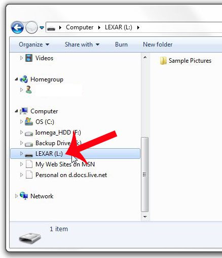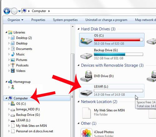 步骤 3:在下面找到您的 USB 闪存驱动器电脑窗口左侧的部分。如果您不确定哪个选项是闪存驱动器,请单击电脑选项,然后检查闪存驱动器具有可移动存储的设备部分。