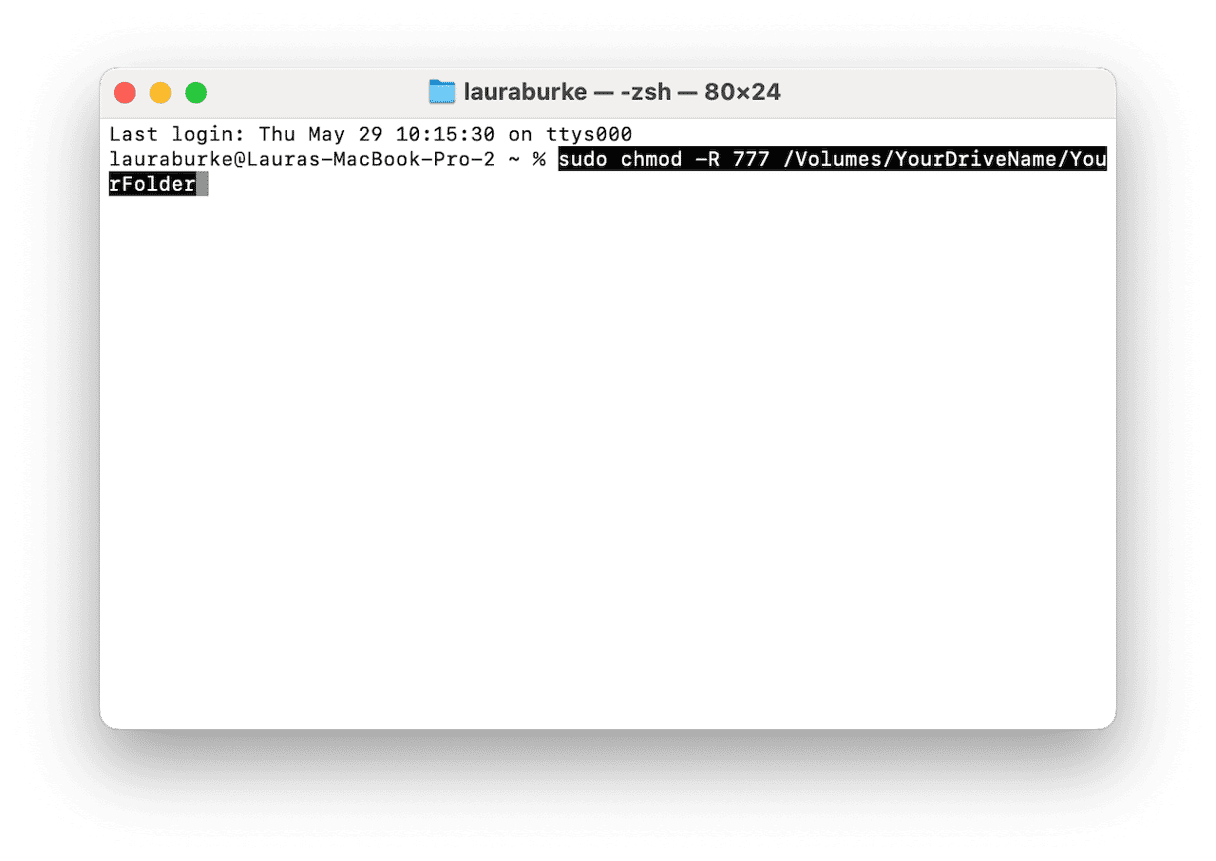 sudo chmod -R 777 /Volumes/YourDriveName/YourFolder - 代替