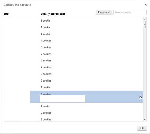 步骤 6:单击您要删除其 cookie 的网站,然后单击X在窗口的右侧。