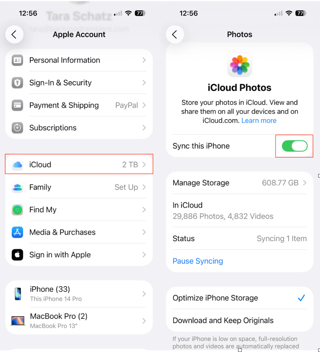 - 在 iPhone 上,前往“设置”>“[您的名字]”>“iCloud”>“照片”。