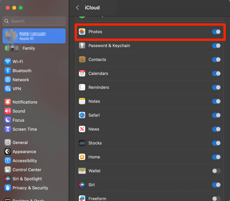 - 到关闭 iCloud 照片同步,前往 Apple 菜单 > 系统设置 > Apple ID > iCloud > 照片并将其关闭。