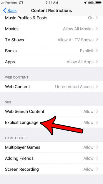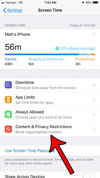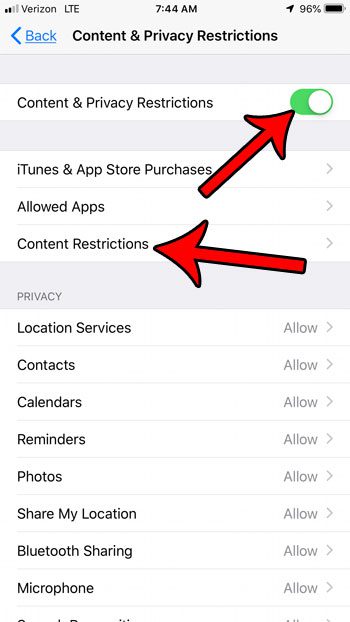 第 4 步:点击内容和隐私限制屏幕顶部的按钮将其打开,然后选择内容限制选项。