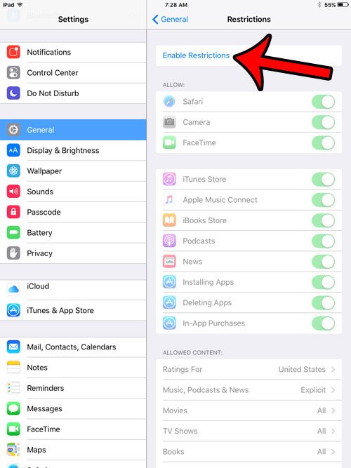 幸运的是,iPad 有一个特殊的“限制”菜单,您可以调整该菜单以禁用或删除设备中的某些特性和功能。