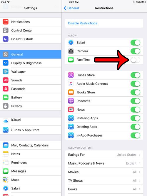 如果您要在孩子的 iPad 上禁用 FaceTime,那么您应该查看此菜单上的其他选项,因为您还可以阻止某些网站并阻止购买应用程序或应用程序内购买。