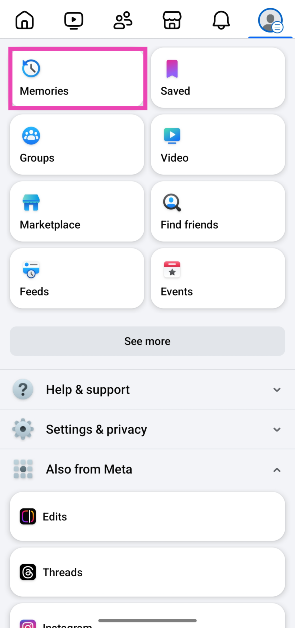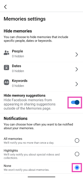 在手机上启动 Facebook 应用程序并点击您的个人资料图标。转到“回忆”,点击齿轮图标,然后在通知下选择“无”。此外,打开“隐藏内存建议”旁边的切换开关。