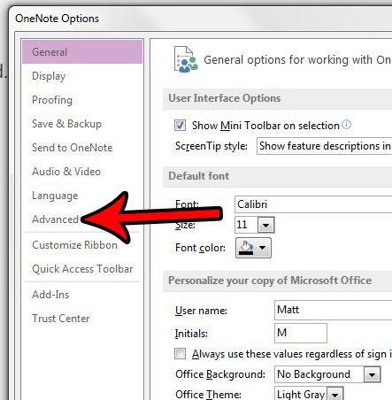 第 4 步:选择先进的左栏中的按钮OneNote 选项窗户。