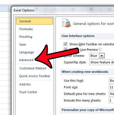 - 单击先进的左侧的选项卡Excel 选项窗户。
