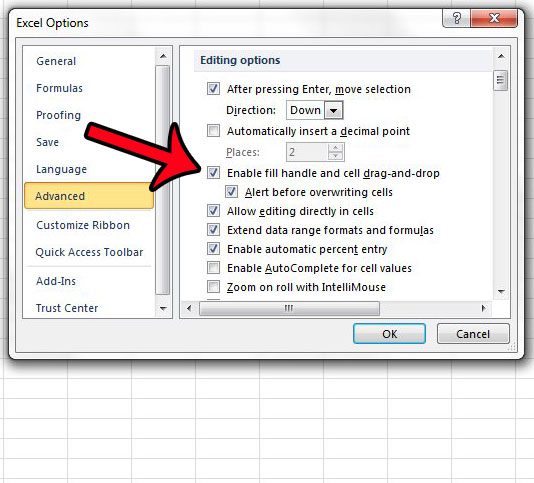 本文中的步骤将向您展示在哪里可以找到控制是否在 Excel 2010 中显示填充柄的设置。因此,如果您想知道填充柄在哪里,则可以使用这些步骤将其打开。或者,如果您想去掉填充手柄,也可以这样做。