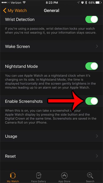 当按钮周围有绿色阴影时,您将能够在 Apple Watch 上截取屏幕截图。下图中已启用屏幕截图。
