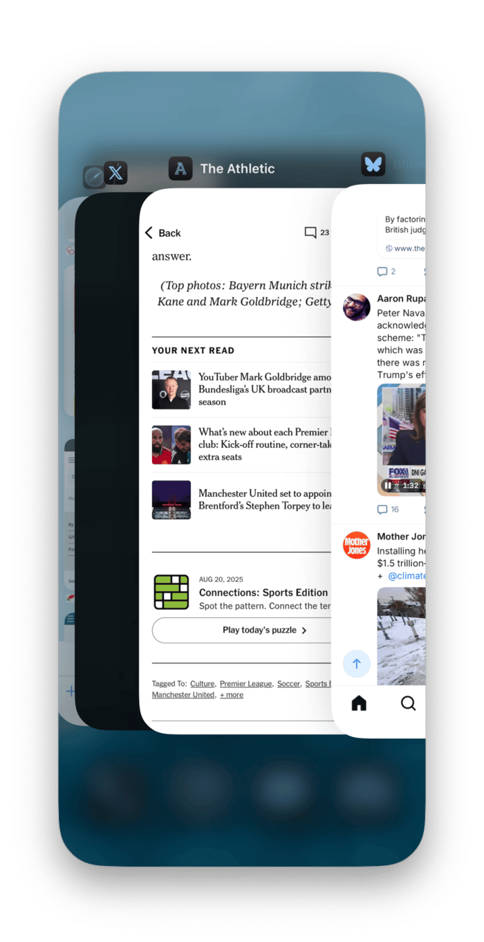 - 将光标移至 iPhone 屏幕顶部上方即可查看窗口的轮廓。在那里你会看到两个图标。看起来像网格的那个将带您从任何地方返回主屏幕。另一个激活应用程序切换器。