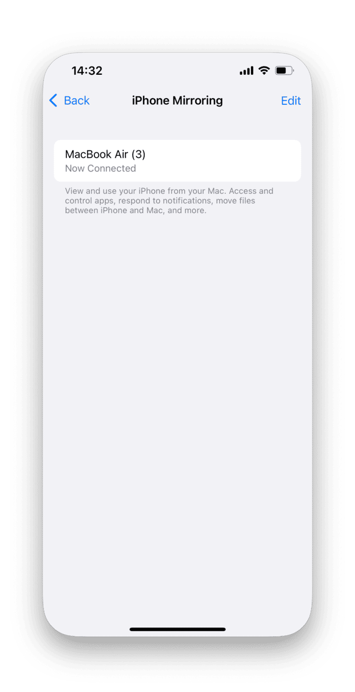 - 要停止将 iPhone 与 iPhone 镜像结合使用,请前往“设置”>“通用”>“AirPlay 和连续性”,然后点击“iPhone 镜像”。然后,点击“编辑”并选择您的 Mac 将其删除。