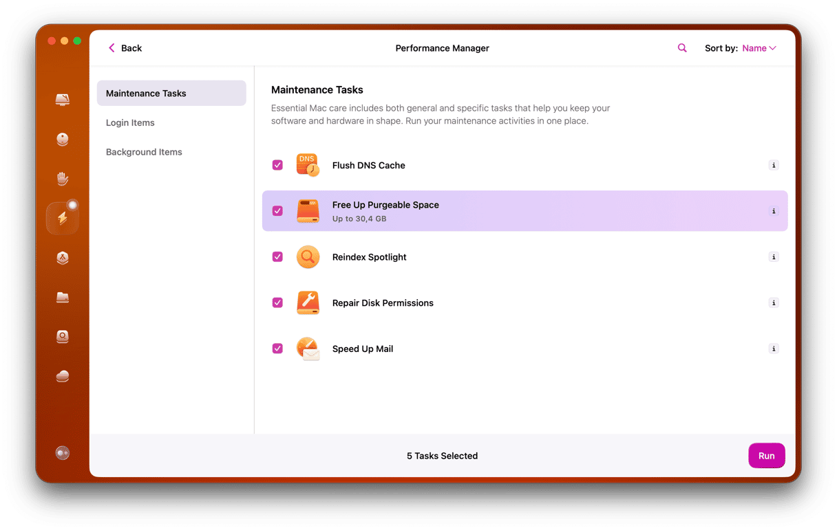 完全重置系统的另一种方法是运行一些有针对性的维护例程。我在这部分使用 CleanMyMac。在其性能功能中,我运行了一些维护任务,例如刷新 DNS 缓存、修复磁盘权限以及检查我的后台项目;方法如下: