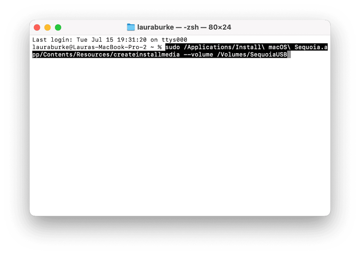 - 现在,复制此命令并将其粘贴到终端中,如果您为 U 盘指定了不同的名称,则替换 SequoiaUSB:
