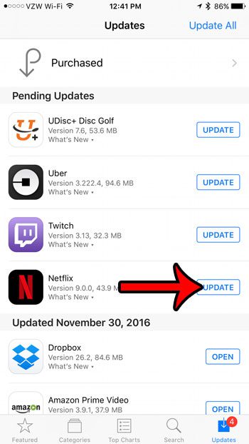 以下步骤是在运行 iOS 10.1 的 iPhone 7 Plus 上执行的。我使用的是截至 2016 年 11 月 30 日可用的最新版本的 Netflix 应用程序。按照以下步骤,我们将首先进入 App Store,以确保您使用的是更新版本的 Netflix 应用程序。