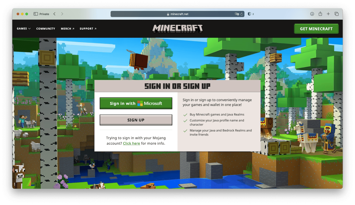 下载 Minecraft 需要做的第一件事是创建一个帐户或登录您的 Microsoft 帐户(如果您有 Microsoft 帐户)。