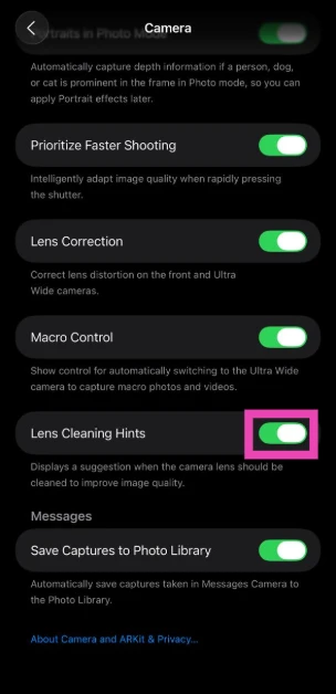 前往设置>相机然后打开“镜头清洁提示”旁边的切换开关。此功能仅适用于iOS 26。