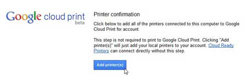 然后,您应该会收到一条确认消息,告诉您 Google 云打印已准备就绪。您还可以单击管理您的打印机窗口中心的链接可查看连接到您的计算机且已添加到 Google 云打印的打印机。
