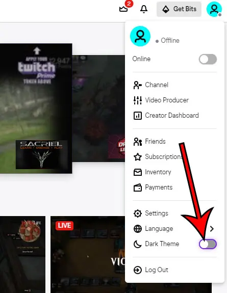 如果您打开 Twitch,点击屏幕右上角的用户图标,然后将深色模式切换按钮切换为“打开”,则可以将 PC 上的 Twitch 帐户设置为深色模式。