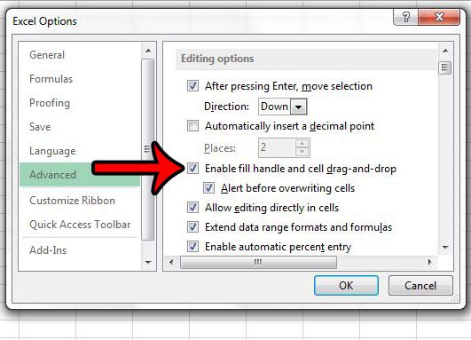 步骤 5:选中左侧的框启用填充柄和单元格拖放。您还可以选择是否希望 Excel 在您要覆盖单元格时发出警报。完成后,单击好的按钮位于窗口底部。