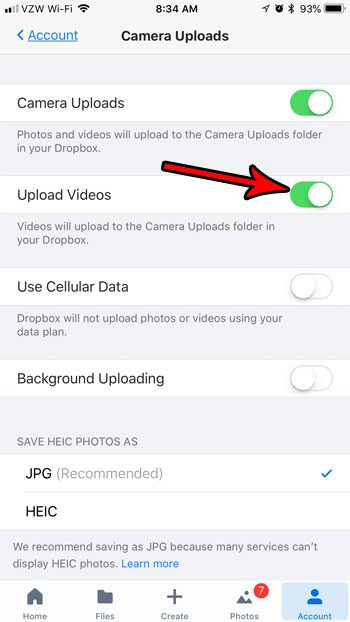 这是为了节省您的 Dropbox 帐户空间,但如果您想使用它,则可以使用该功能。我们下面的教程将向您展示如何在 iPhone 上的 Dropbox 中启用视频上传。
