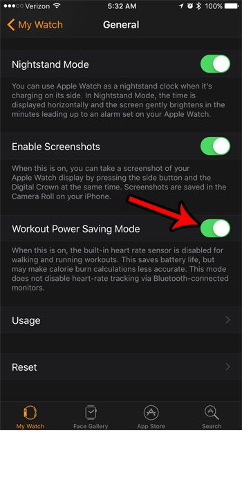 步骤 4:滚动到此菜单的底部,然后点击右侧的按钮锻炼省电模式。当按钮周围有绿色阴影时,该设置启用。我已经为我的 Apple Watch 打开了锻炼省电模式,如下图所示。