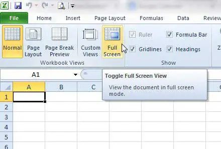 您可能通过单击进入全屏视图全屏上的选项看法工作表的选项卡,如下图所示。