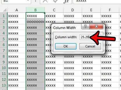 步骤 3:删除现有的列宽值,输入更大的值,然后单击好的按钮。默认列宽为 8.43,因此列宽 16.86 将使列宽加倍,25.29 将使宽度加倍,等等。但是请注意,您不仅需要以倍数进行工作。您可以输入 20、40 或适合您需要的任何其他值。