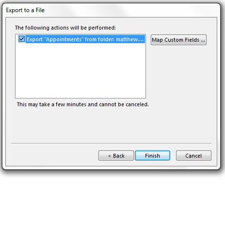 第 9 步:单击结束按钮创建日历的导出 .csv 文件。请注意,如果您的日历中有定期约会,则需要指定要导出的定期约会的日期范围,Outlook 会将它们作为单独的约会包含在内。