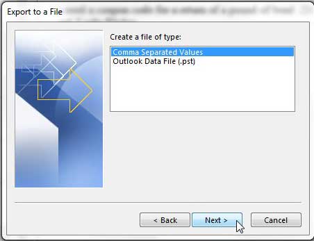 在将 Outlook 2013 联系人导出为 .csv 文件格式的过程中,您可以选择将其导出为 .pst 文件。
