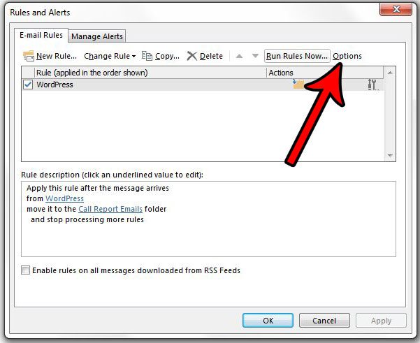 第 4 步:单击选项按钮位于右上角规则和警报窗户。