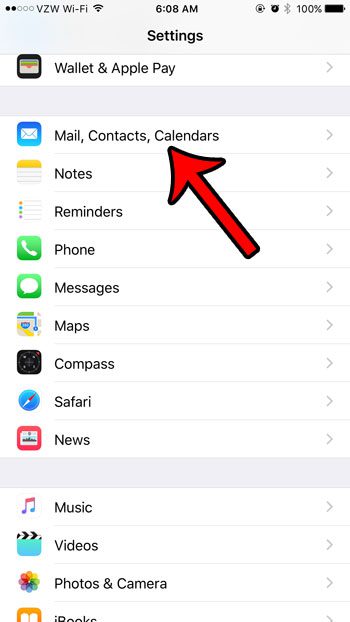 第 2 步:向下滚动并点击邮件、通讯录、日历选项。
