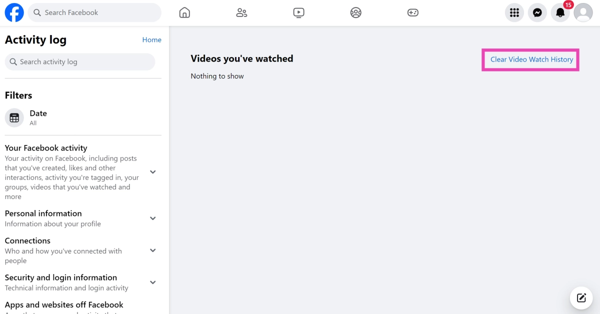 要解决此问题,您可以从观看历史记录中删除该视频。这将减少其对建议内容算法的影响。您可能想要删除视频历史记录的另一个原因是让您的 Facebook 活动远离窥探。如果有人访问您的设备,他们可以通过访问您的“活动日志”轻松了解您在平台上观看的内容。
