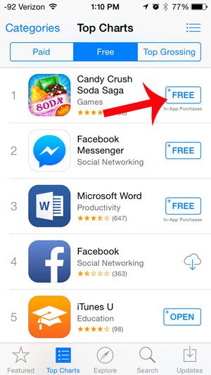 现在,您将看到整个 App Store 中最受欢迎的免费应用程序的列表。只需触摸自由的任何应用程序右侧的按钮,以便将其下载到您的设备。