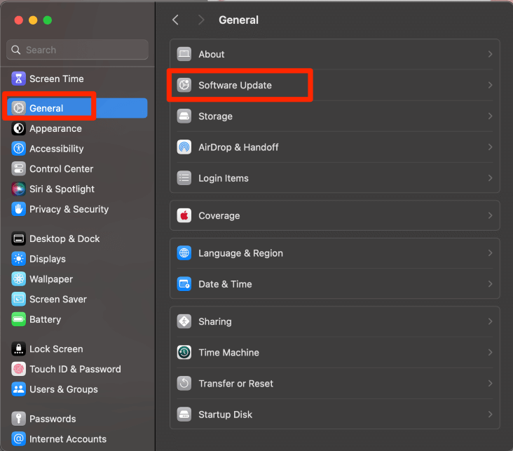 在左侧,导航至一般的。然后,选择软件更新在右侧。