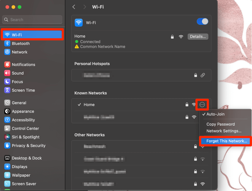 在左侧,导航至 Wi-Fi。然后,单击网络名称旁边有三个点的圆圈你遇到麻烦了。在出现的菜单中,选择忘记这个网络...