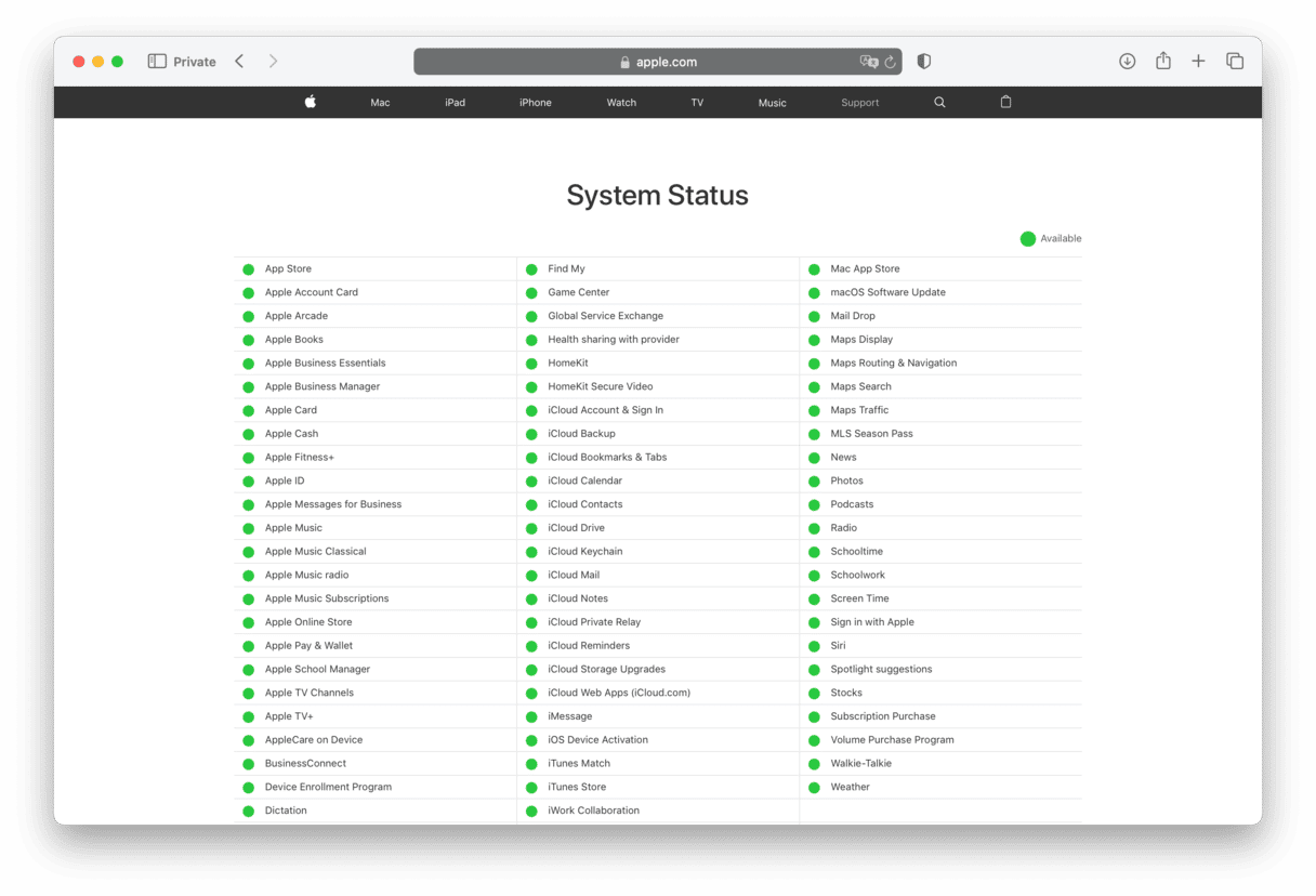 如果您的互联网连接正常,那么就该检查另一端——Apple 的服务器了。 Apple 在其网站上有一个页面,您可以在其中查看其所有在线服务的状态,包括更新。该页面是这里。单击该链接并查找“macOS 软件更新”。如果它旁边有绿灯,则说明工作正常。如果没有,则更新服务器可能有问题,您必须等待它修复。