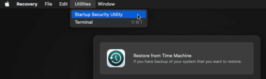 如果您仍然无法从外部磁盘启动,请尝试关闭控制可以启动的操作系统版本的安全启动设置。为此,请再次以恢复模式重新启动,然后从“实用程序”菜单中选择“启动安全实用程序”。这次,在“安全启动”部分中选择“无安全性”。正常重新启动您的 Mac,然后重试。