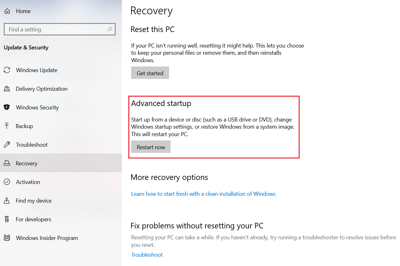 步骤2:单击左侧的“恢复”。在“高级启动”下,单击“立即重新启动”。