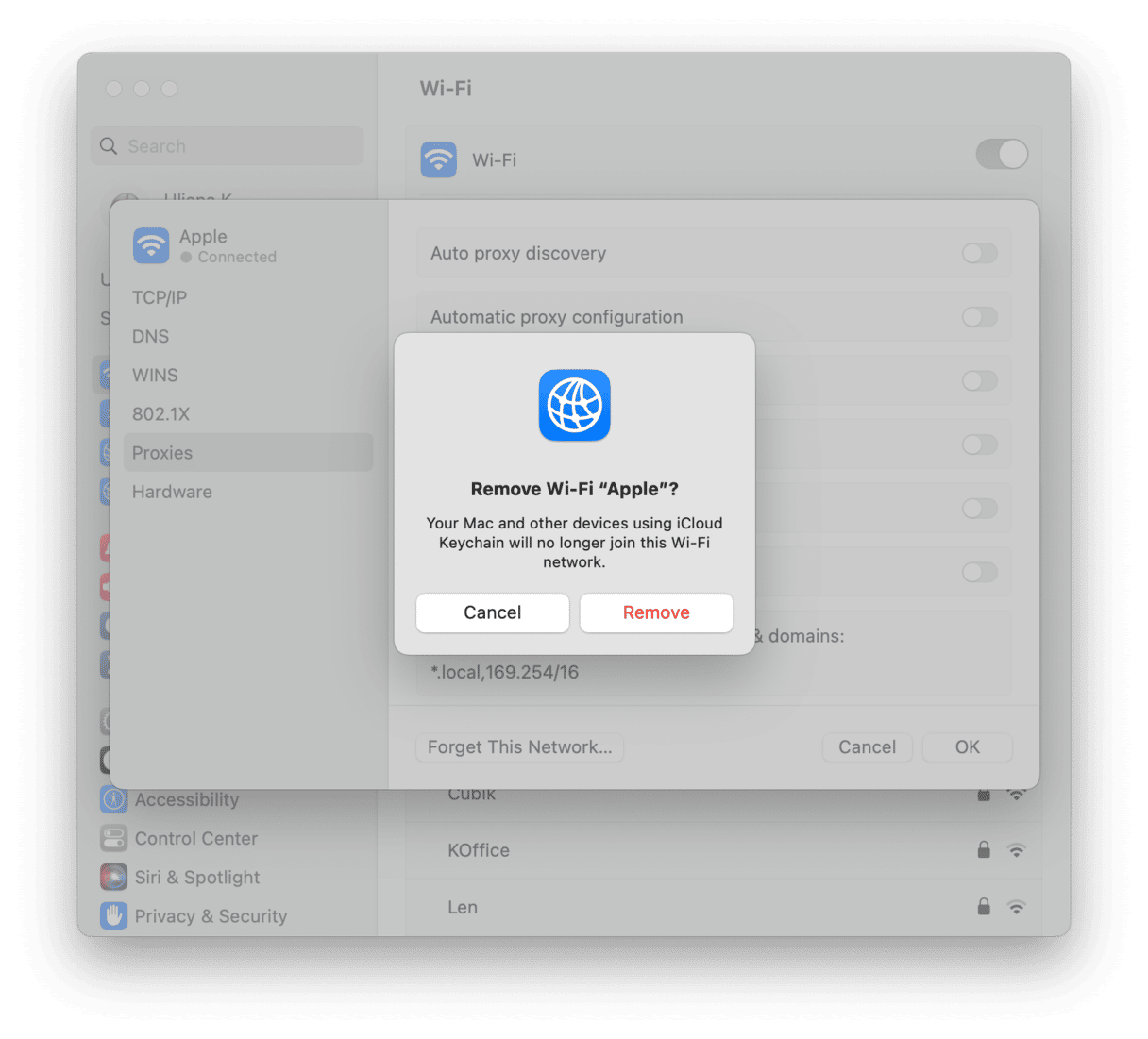 您是否知道您的 Mac 会保存您连接到的所有 Wi-Fi 网络的列表,并将其与 iCloud 同步?这意味着您连接的每个 Wi-Fi 网络都会被存储,即使该网络不安全。理由是,它可以让您的 Mac 下次在网络范围内时更轻松地进行连接。但如果网络不安全,这不是您想要的。当您想要连接到不同的网络时,它可能会导致问题。解决方案是删除所有这些旧网络。因此,请转到“系统设置”>“Wi-Fi”并删除所有未连接的网络。要执行此操作,请按照提示#4 中概述的步骤进行操作。