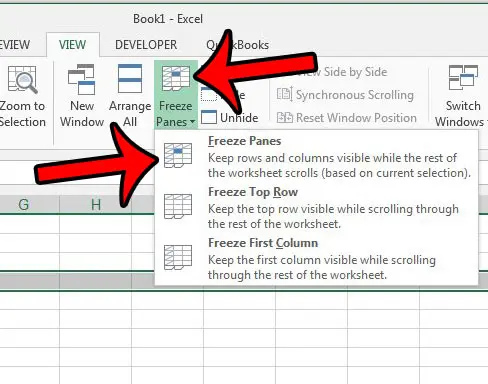 第 4 步:单击冻结窗格按钮在窗户导航功能区的部分,然后单击冻结窗格下拉菜单上的选项。