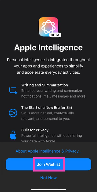 将您的 iPhone 更新至 iOS 18.1,然后前往“设置”>“Apple Intelligence 和 Siri”并点击“加入 Apple Intelligence 候补名单”。 Apple Intelligence 功能需要几分钟时间才会出现在您的手机上。