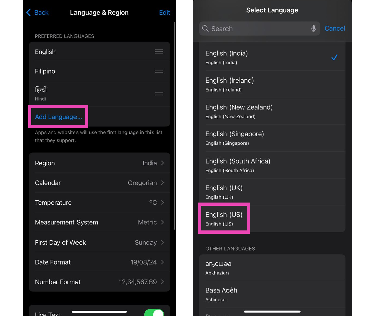 将您的 iPhone 更新到 iOS 18.1,然后将 iPhone 的语言更改为英语(美国)。您可以通过以下方式执行此操作:设置>常规>语言和区域>添加语言。将 Siri 的语言也更改为美国英语。