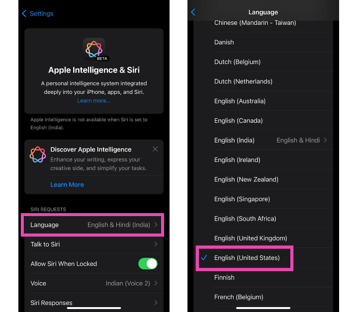 截至目前,Apple Intelligence 仅提供美国英语版本。如果您使用本地化版本的英语(例如英国、印度、新西兰和澳大利亚),则需要将设备的语言更改为美国版本的英语。完成后,您可以使用上述步骤来访问 Apple Intelligence。以下是更改设备语言的方法。