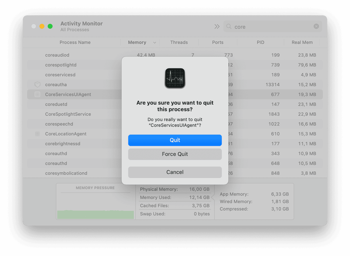 - 使用活动监视器。转到“应用程序”>“实用程序”,然后打开“活动监视器”。使用搜索框搜索 CoreServicesUIAgent。找到它后,选择它并单击工具栏中的“x”退出它。